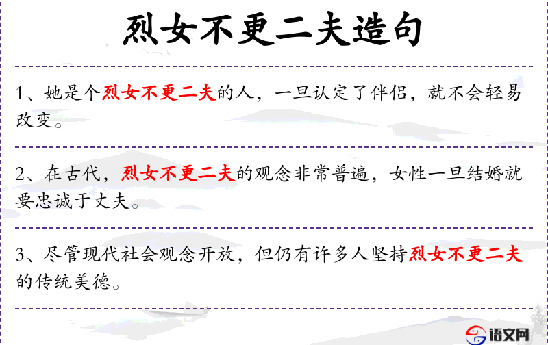 1. 【烈女不更二夫】 烈女:刚正有节操的女子。贞烈的妇女不嫁第二个丈夫。