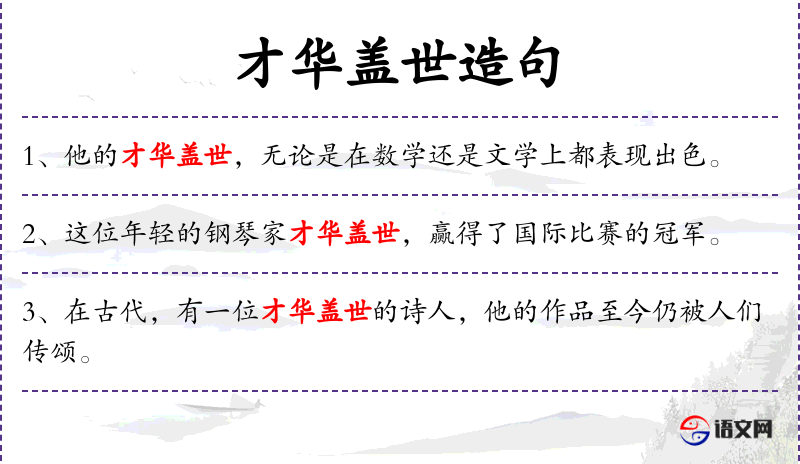 1. 【才华盖世】 盖:覆盖,超过。才能很高,远远超过当代的人。