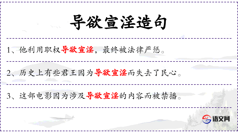 - 导欲宣淫:形容词,指引导欲望和宣扬淫秽的内容。