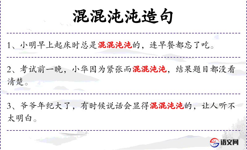 5. 【混混沌沌】 迷糊不清的样子,模糊一片,不分明。