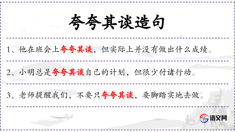 反义词:夸夸其谈 → 沉默寡言;付诸行动 → 空想、幻想。