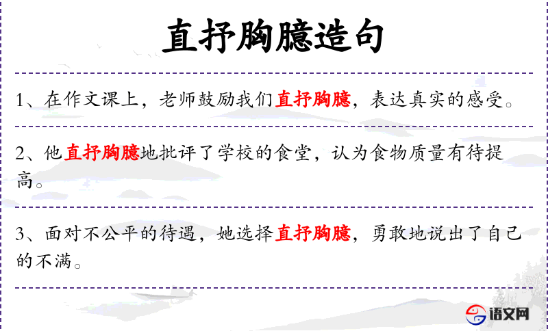 1. 【直抒胸臆】 胸臆:胸腔,内心,引申为心意。直率地抒发自己的思想感情。