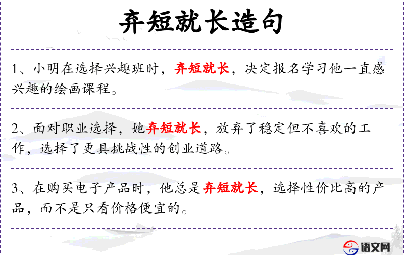 - 相关成语:弃短就长(放弃短期的利益,追求长远的利益)