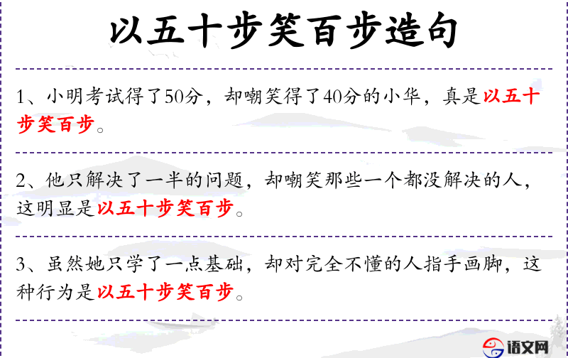 3. 【以五十步笑百步】 作战时后退了五十步的人讥笑后退了百步的人。比喻自己跟别人有同样的缺点错误,只是程度上轻一些,却毫无自知之明地去讥笑别人。