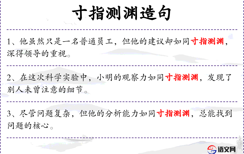 句子:“尽管问题复杂,但他的分析能力如同寸指测渊,总能找到问题的核心。”