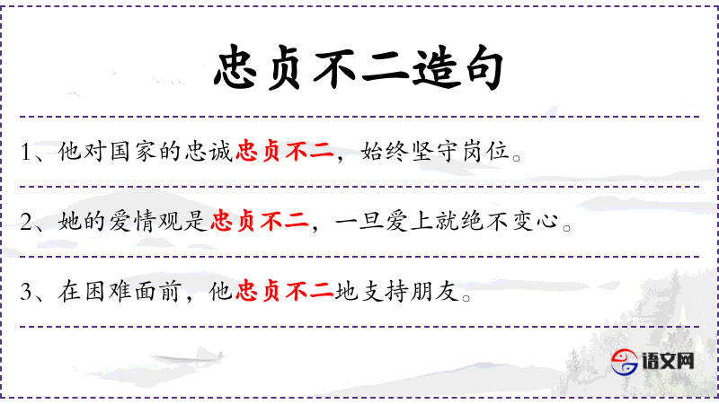 - 谓语:“忠贞不二”、“不改变”
