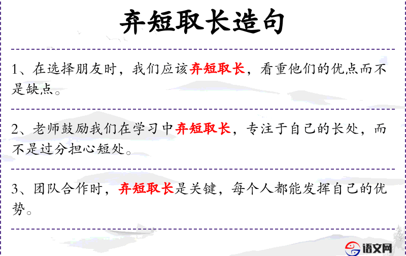 - 相关成语:“取长补短”是与“弃短取长”相关的成语,意指利用长处弥补短处。