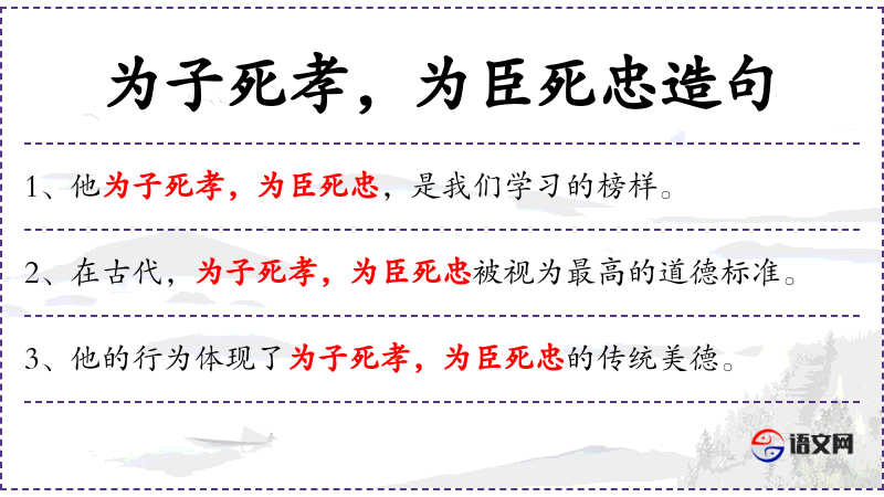- 宾语:为子死孝,为臣死忠的精神
