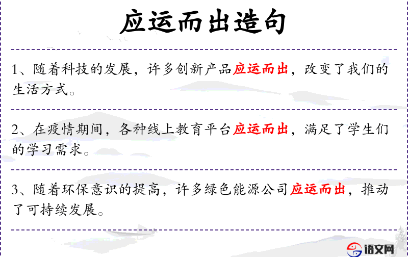 1. 【应运而出】 应:顺应;运:原指天命,泛指时机。旧指应天命而产生。现指适应时机而产生。