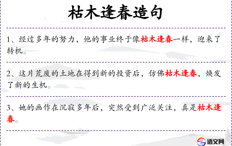7. 【枯木逢春】 逢:遇到。枯干的树遇到了春天,又恢复了活力。比喻垂危的病人或事物重新获得生机。