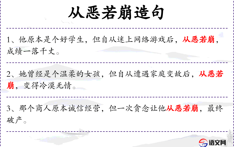 - 成语:从恶若崩,源自“从善如登,从恶如崩”,比喻从好变坏很容易,从坏变好很难。