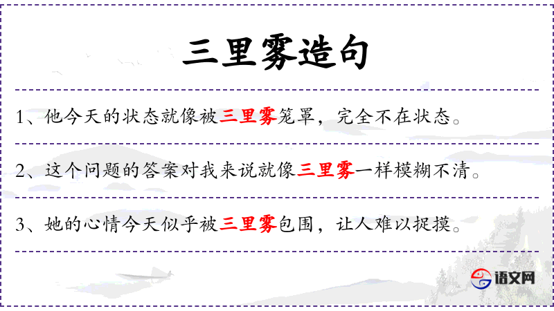 谓浓雾。《后汉书.张楷传》"﹝楷﹞性好道术﹐能作五里雾。时关西人裴优亦能为三里雾﹐自以不如楷﹐从学之﹐楷避不肯见。"唐李商隐《圣女祠》诗"无质易迷三里雾﹐不寒长着五铢衣。"后亦用以借指道术。