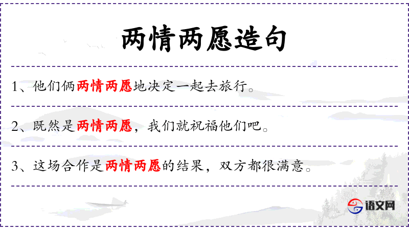 - “两情两愿”:成语,意思是双方都愿意,没有强迫。