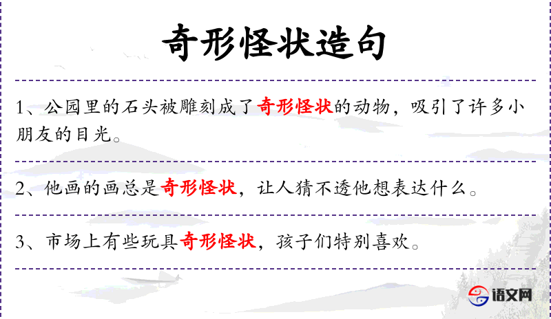 - “许多小朋友被公园里雕刻成奇形怪状动物的石头吸引。”