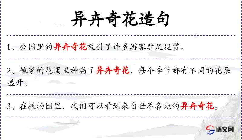 句子:“在植物园里,我们可以看到来自世界各地的异卉奇花。”