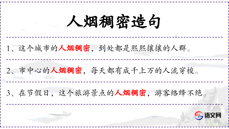 - 人烟稠密:人口密集、繁华