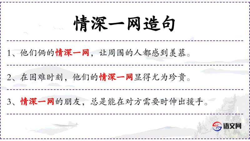 - 情深一网:形容人与人之间的情感非常深厚,如同被一张网紧紧相连。