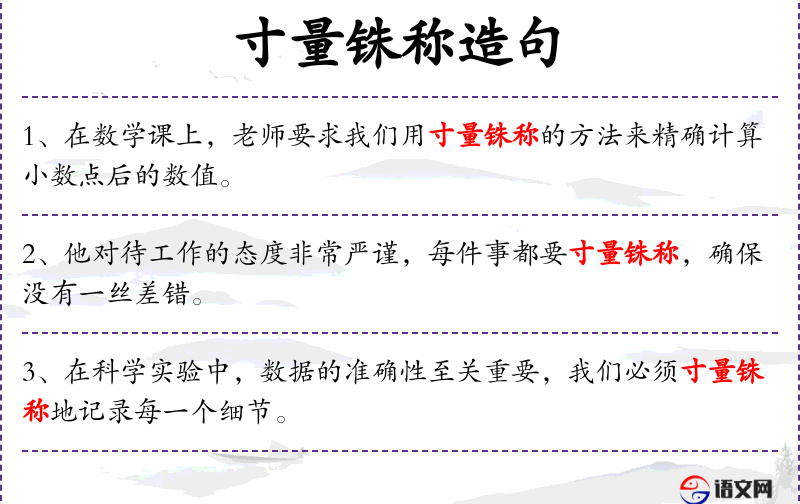- 寸量铢称:形容非常精确和细致的测量。