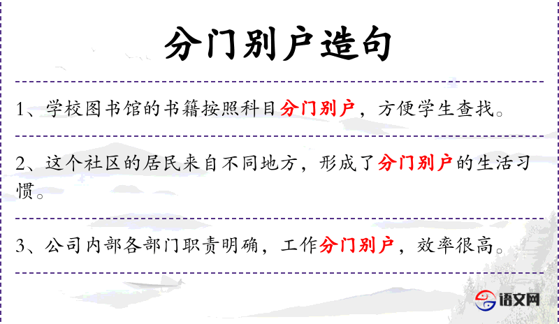 句子:“学校图书馆的书籍按照科目分门别户,方便学生查找。”