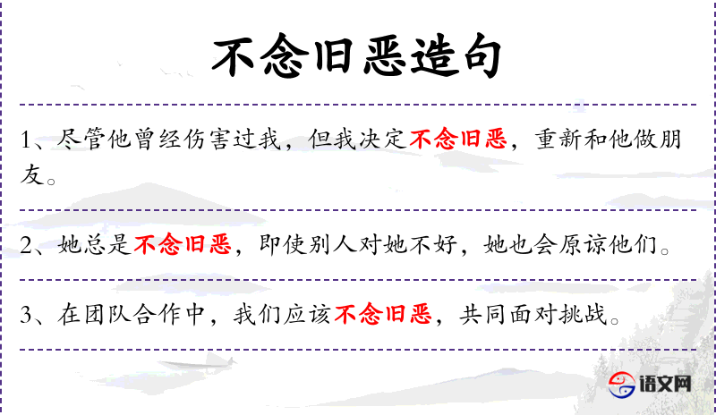- 不念旧恶:指不记过去的仇恨或过错,强调宽容和原谅。