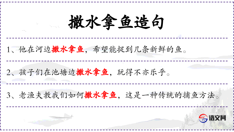 - 撒水拿鱼:动宾短语,表示一种捕鱼的方法或技巧。
