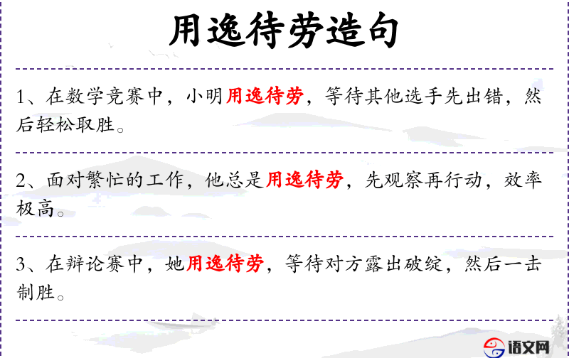 3. 【用逸待劳】 - 以逸待劳。谓作战时采取守势,养精蓄锐,待敌军奔走疲惫之后,乘机出击以取胜。