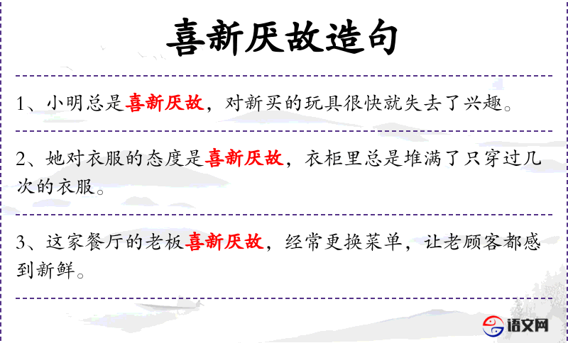 - 喜新厌故:形容人喜欢新的,讨厌旧的。