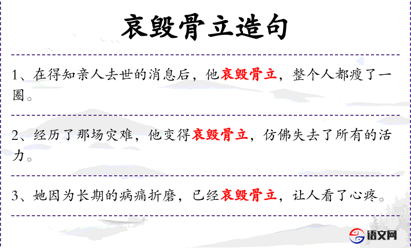 - 哀毁骨立:形容人极度悲伤,身体消瘦,精神萎靡。