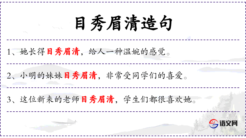 目:眼睛;秀:秀丽;眉:眉毛;清:清新。形容人容貌清秀俊美。