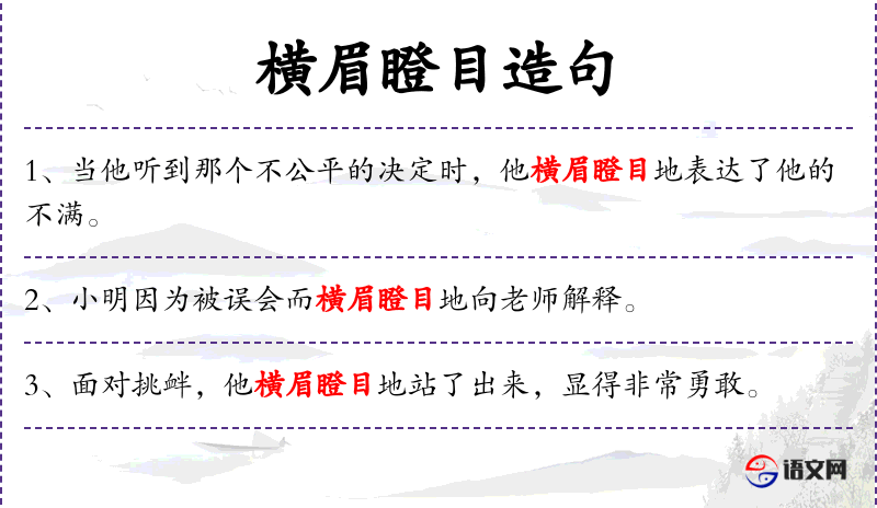 1. 【横眉瞪目】 - 形容怒目相视,态度凶狠的样子。同“横眉努目”。
