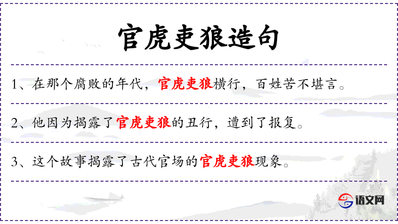 - 官虎吏狼:这个成语反映了古代**社会对官员和吏员的负面看法,认为他们像虎狼一样凶残。