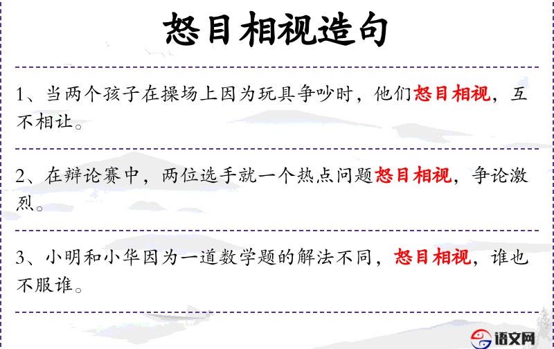 - 怒目相视:动词短语,表示双方对峙的状态。