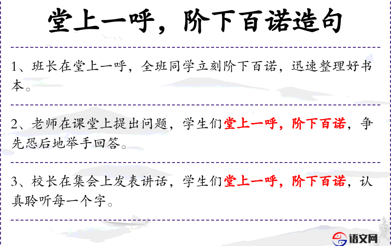 - 定语:学生们堂上一呼,阶下百诺,认真聆听每一个字