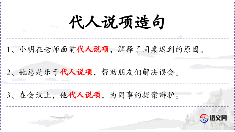 - 代人说项:指代替他人说话或表达意见,通常用于帮助他人解决困难或表达诉求。