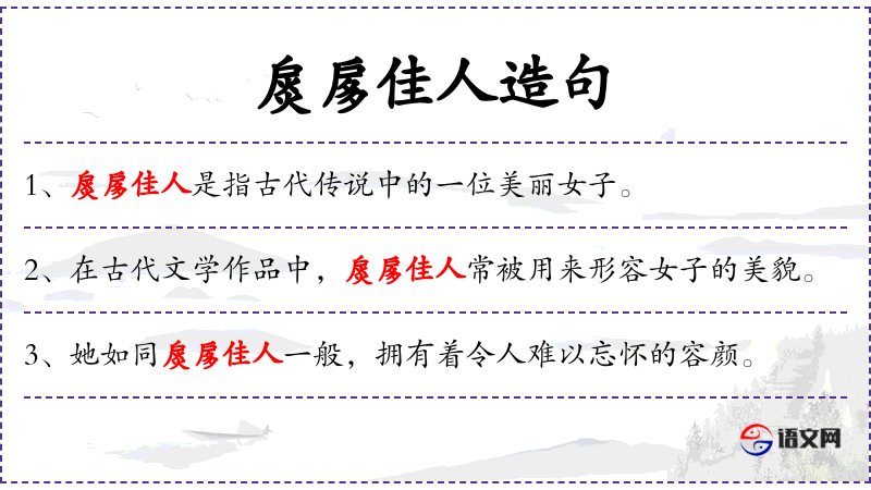 句子:“[她的美丽让人想起了古代的扊扅佳人,令人心生敬仰。]”
