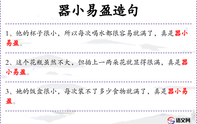 - 器小易盈:成语,表示容器小容易装满