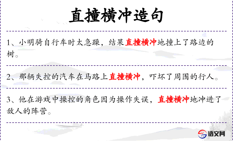 2. 【直撞横冲】 - 形容向前突破,不可阻挡或毫无顾忌地乱冲乱闯。