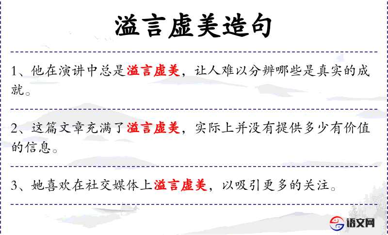 1. 【溢言虚美】 - 过甚其辞、不符合实际地称美。