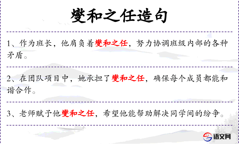 4. 【燮和之任】 燮和:调和。比喻宰相之职,以宰相的职责在协调国家上下。
