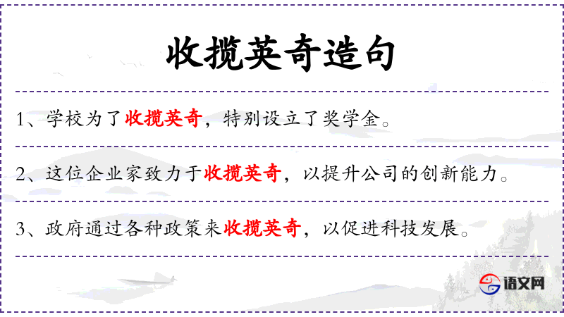 1. 【收揽英奇】 收揽:招纳。招纳英雄奇才。