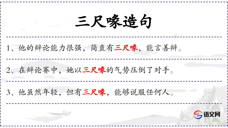 1. 【三尺喙】 - 《庄子.徐无鬼》"丘也闻不言之言矣,未之尝言,于此乎言之。市南宜僚弄丸而两家之难解,孙叔敖甘寝秉羽而郢人投兵。丘愿有喙三尺。"后多用以比喻能言善辩; 用以状嘴之长而尖利。