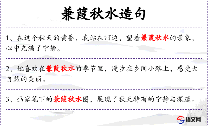 - 兼葭秋水:这是一个富有诗意的表达,指的是秋天水边的景象,兼葭指的是芦苇,秋水则指秋天的河水。