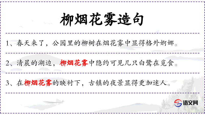1. 【柳烟花雾】 - 形容春色迷濛的景象。