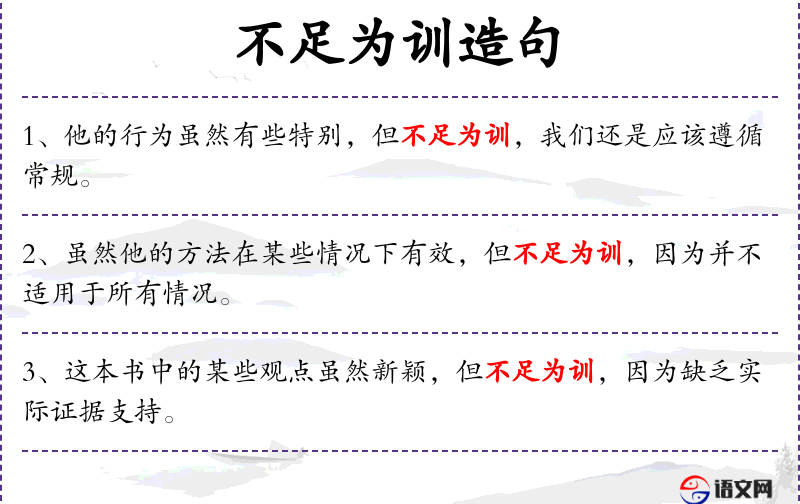 1. 【不足为训】 足:够得上;训:法则,典范。不值得作为效法的准则或榜样。