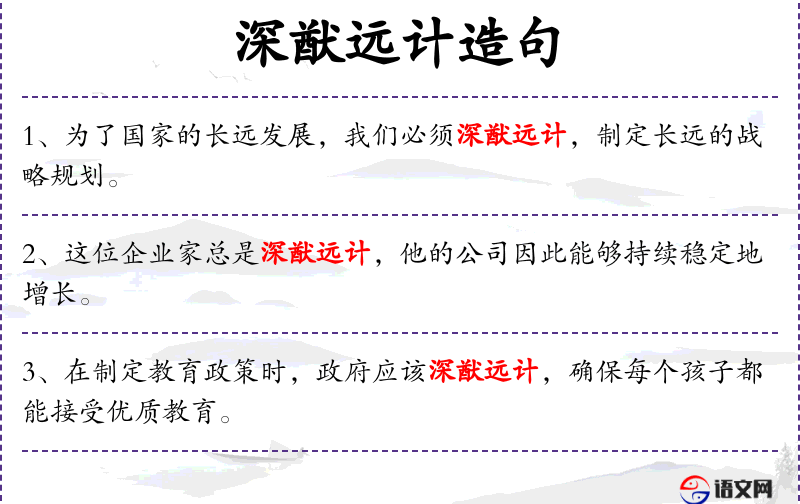 6. 【深猷远计】 指计划得很周密,考虑得很长远。同“深谋远虑”。