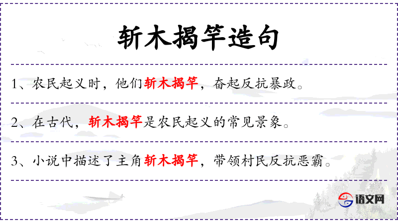 斩木揭竿是一个成语,源自《史记·陈涉世家》,描述陈胜、吴广起义时的情景。这个成语常用来比喻人民起义反抗暴政。通过学*这个成语,学生们不仅了解了历史*,还学了的传统文化和成语的用法。