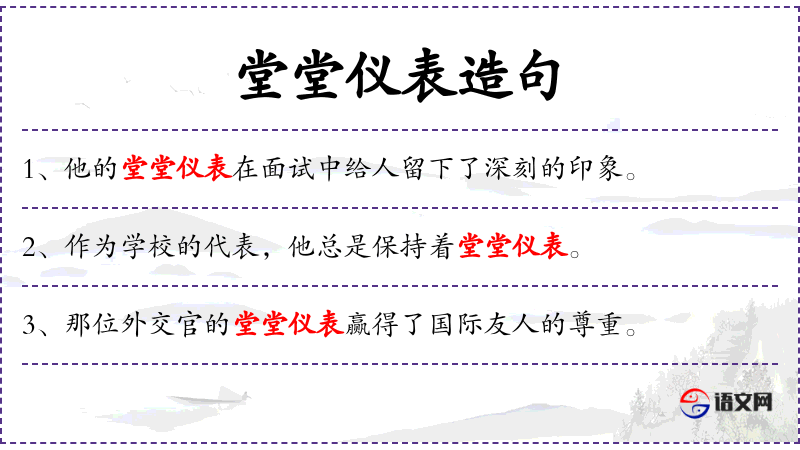 - 堂堂仪表:形容词短语,指外表庄重、得体。