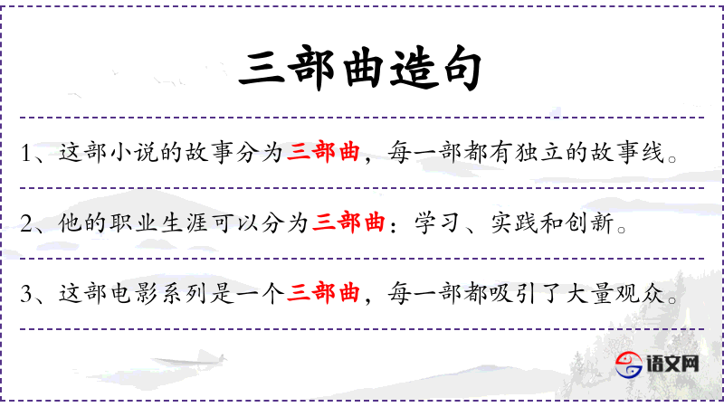 2. 【三部曲】 源出古希腊,指情节联贯的三部悲剧,如埃斯库罗斯的《奥列斯特》◇泛指三部内容各自独立而又互相连贯的文学作品。如茅盾的《幻灭》﹑《动摇》﹑《追求》三部曲。亦借指发展过程的三个阶段。