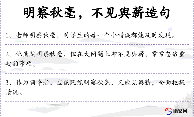 - 明察秋毫:这个成语源自**古代,形容人的观察力极其敏锐。