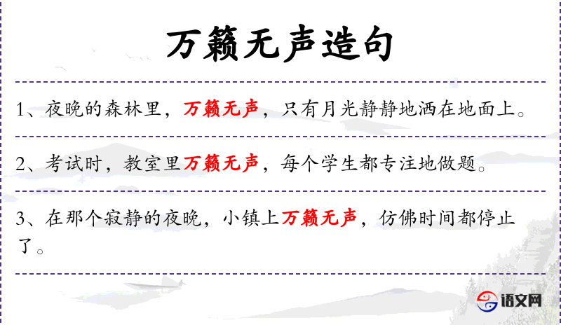 1. 【万籁无声】 形容周围环境非常安静,一点儿声响都没有。